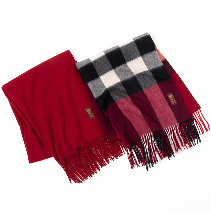 どんな服装にも合わせやすいワインレッド単色と、エンジと黒の濃淡で織りなすチェックの2デザインをご用意しました。