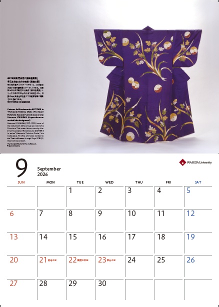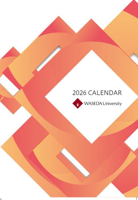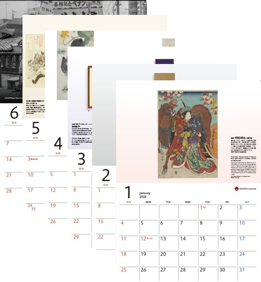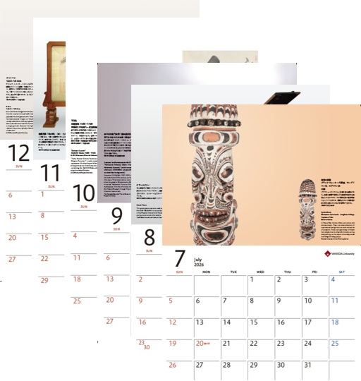 早稲田大学の文化施設および図書館が所蔵する美術工芸品や書画、博物資料などに、解説文(日本語・英語併記)を添えて紹介する2026年のカレンダーです。文化資料写真と書き込みのできる月間スケジュールのページを組み合わせた、使いやすい大きさ(A3判)の壁かけカレンダーです。