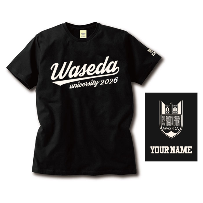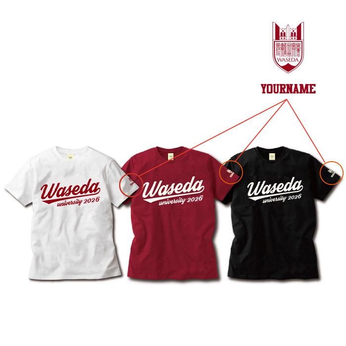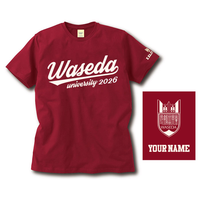 2026の年号入りロゴがデザインされたTシャツの左袖に、早稲田エンブレムと〈お好きな名前〉をプリントする卒業・入学記念特別グッズ。