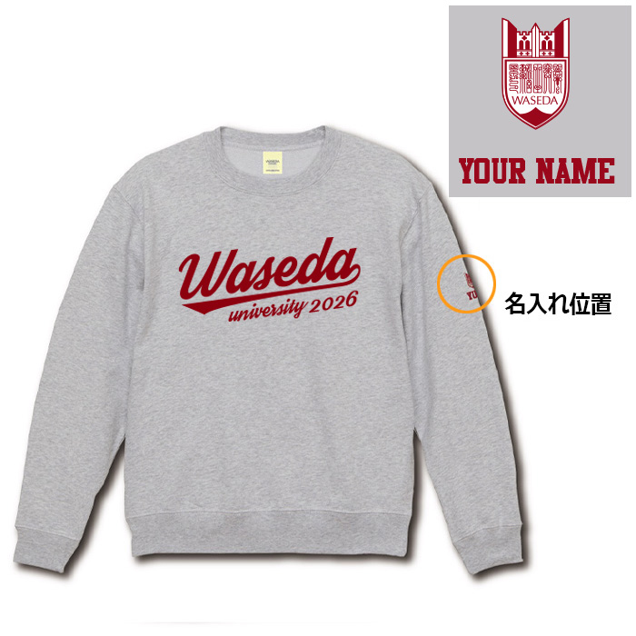 2026の年号入りロゴがデザインされたトレーナーの左袖に、早稲田エンブレムと〈お好きな名前〉をプリントする卒業・入学記念特別グッズ。