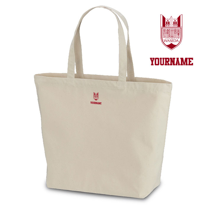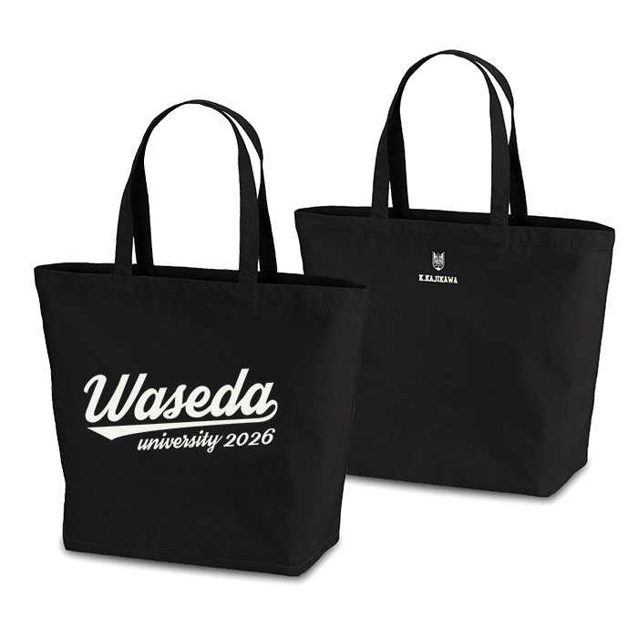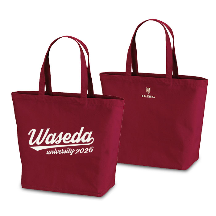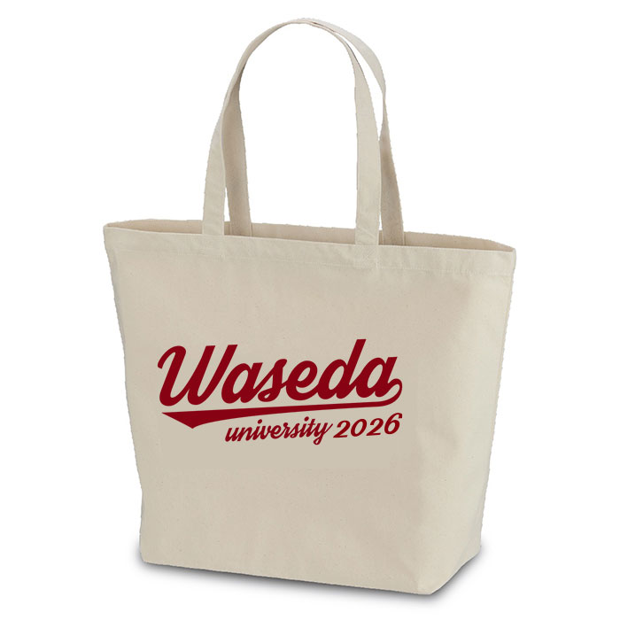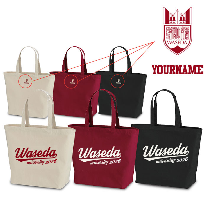 2026の年号入りロゴがデザインされたトートバッグに、早稲田エンブレムと〈お好きな名前〉をお入れする卒業・入学記念特別グッズ。