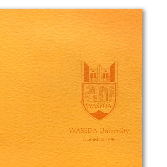エンボス加工のある紙に同系色で早稲田エンブレムをプリント。