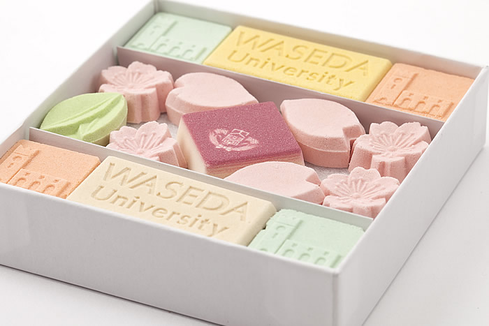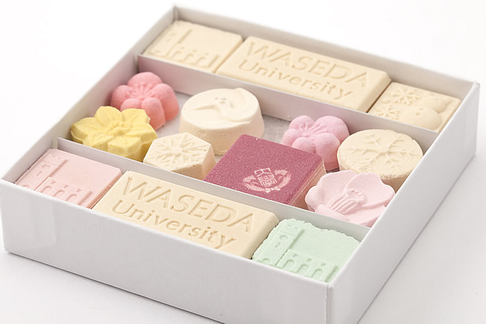 早稲田シンボル、大隈講堂、大学名などオリジナルデザインの和三盆の詰め合わせとなっており、種類も「春」「夏」「秋」「冬」があり、それぞれ季節に合わせた内容となっています。