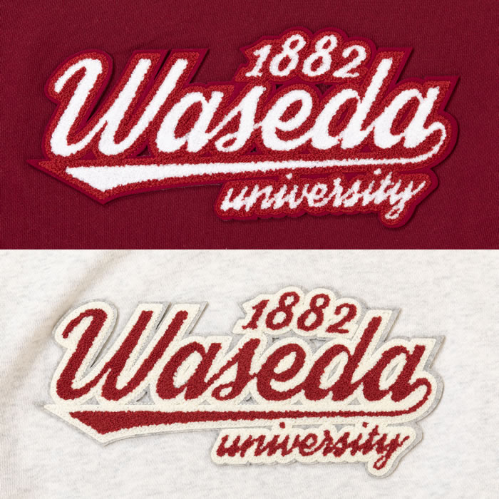 人気の「WASEDA university」筆記体ロゴデザインをサガラワッペンで施した早稲田大学オリジナルパーカー。